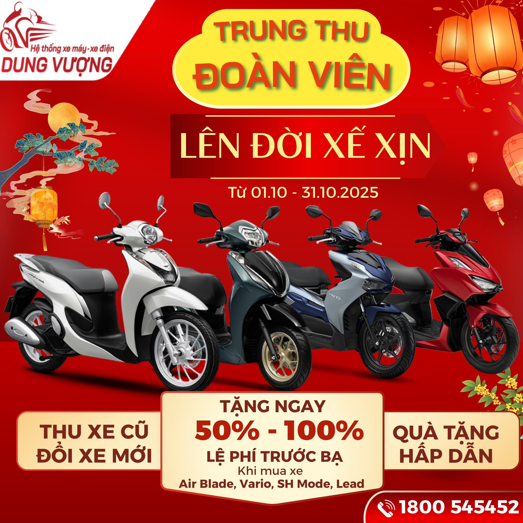 Cơ hội vàng: TẶNG 50% → 100% Lệ Phí Trước Bạ khi mua xe Honda tại Hệ Thống Xe Máy Xe Điện Dung Vượng (01/10 – 31/10/2025).