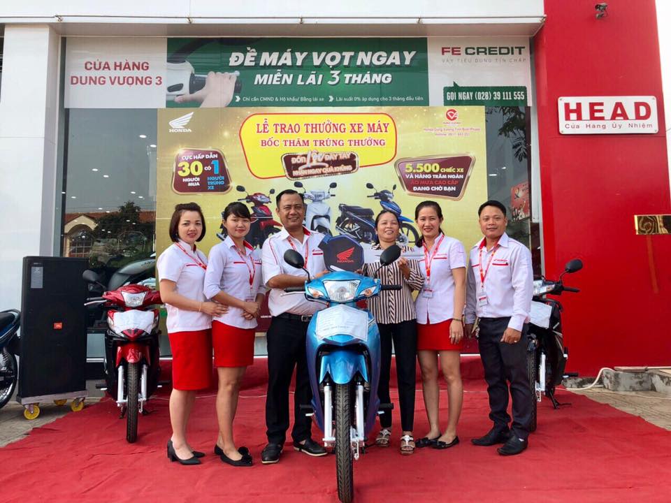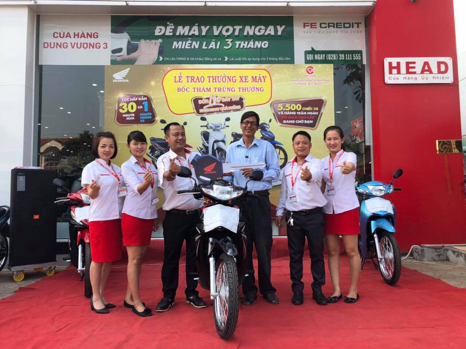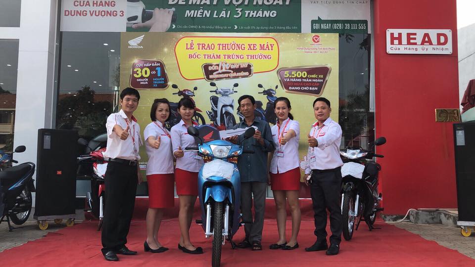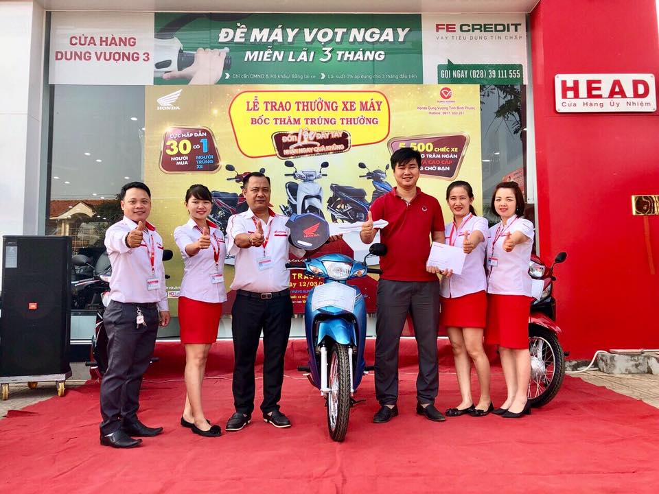 Sáng ngày 12/03/2018, đại diện Công ty TNHH TM Dung Vượng, đã trao thưởng cho những khách hàng đã may mắn trúng thưởng 01 chiếc xe Honda trong chương trình “Đón lộc đầy tay – Nhận ngay quà khủng” Tại HEAD Dung Vượng #3, địa chỉ: Quốc lộ 14 -Tổ 2 - Khu Phố Thanh Bình - P. Tân Bình - TX Đồng Xoài - Tỉnh Bình Phước.