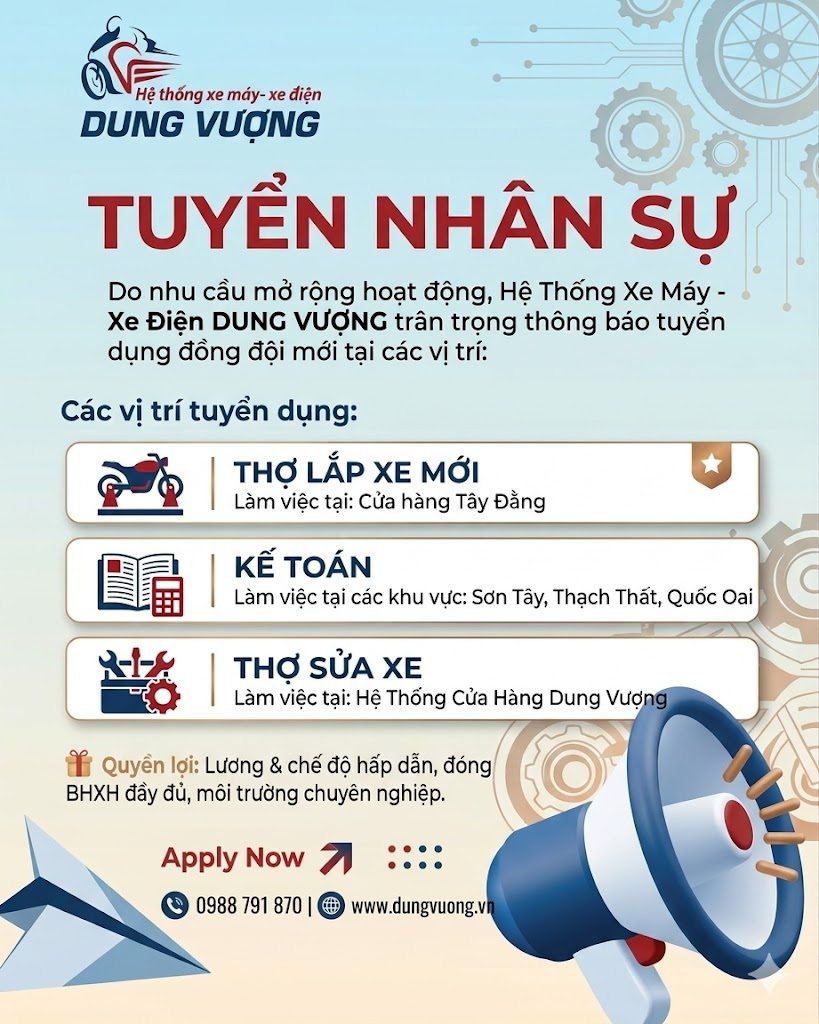 Do nhu cầu mở rộng hoạt động, Hệ Thống Xe Máy – Xe Điện Dung Vượng đang tìm kiếm đồng đội cho các vị trí: