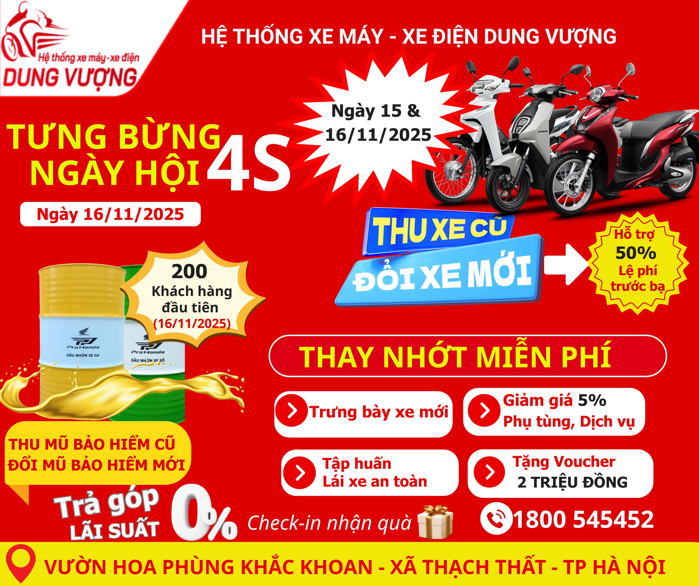 Cùng Hệ Thống Xe Máy – Xe Điện Dung Vượng tận hưởng sự kiện hoành tráng nhất tháng 11 – vui chơi, nhận quà, đổi xe & chăm sóc xế yêu miễn phí!