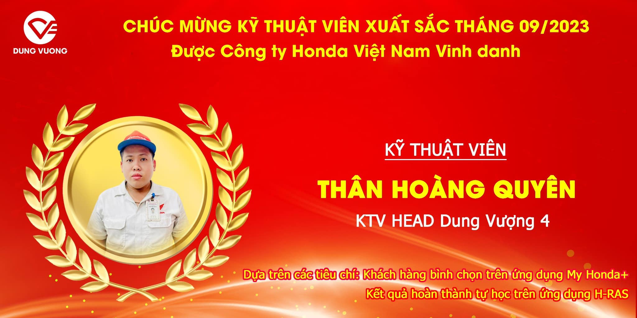 Chúc mừng kỹ thuật viên xuất sắc của Hệ Thống Xe Máy Dung Vượng được Honda Việt Nam vinh danh dựa trên tiêu chí Khách hàng bình chọn trên ứng dụng My Honda+ và Kết quả hoàn thành tự học trên ứng dụng H-RAS tháng 8/2023 và tháng 9/2023