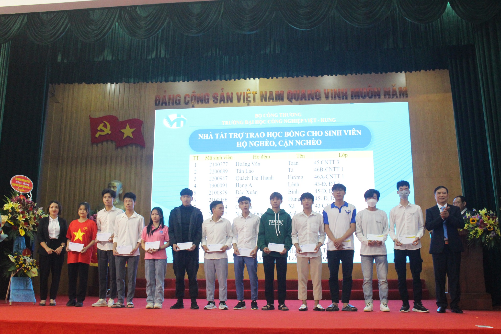 Nhằm hỗ trợ, khích lệ những sinh viên có hoàn cảnh khó khăn, tiếp thêm động lực cho các bạn để vươn lên trong học tập và rèn luyện, ngày 24/11/2022 Đại diện Công ty TNHH TM Dung Vượng đã đến trao học bổng cho sinh viên có hoàn cảnh khó khăn đang theo học tại trường Đại học Công Nghiệp Việt - Hung.