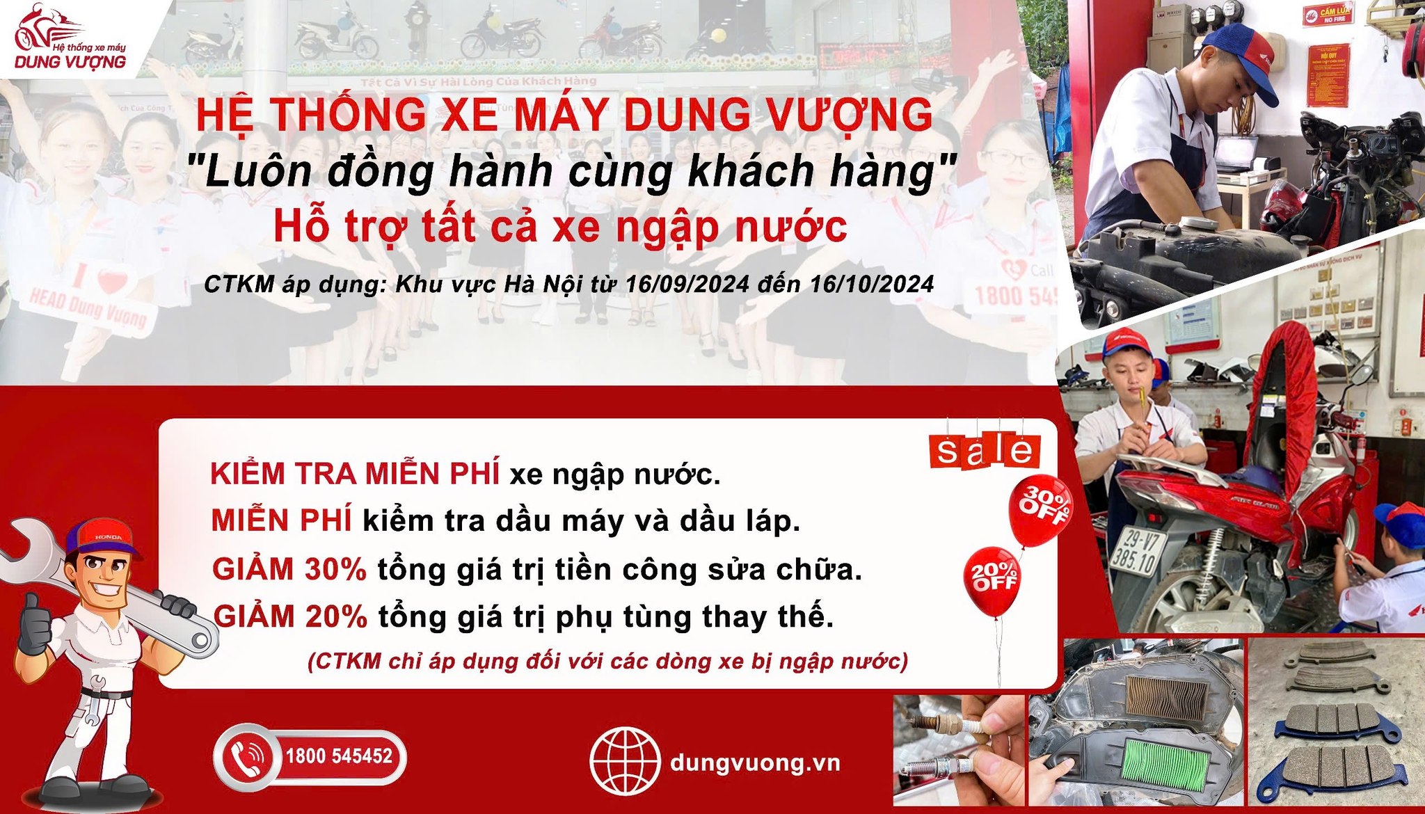 Sau đợt lụt lịch sử tại Hà Nội, nhiều xe bị hư hỏng ngoài ý muốn. Hiểu được những khó khăn của Quý khách, Hệ Thống xe máy Dung Vượng dành tặng chương trình hỗ trợ đặc biệt cho các xe bị ngập nước: