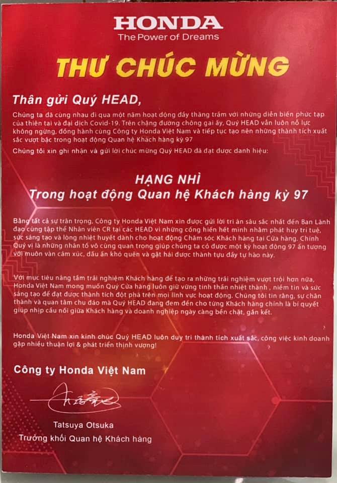 Hôm nay, chúng tôi rất vinh dự nhận được Thư Chúc Mừng từ Công ty Honda Việt Nam, Ghi nhận đạt HẠNG NHÌ Trong hoạt động Quan hệ khách hàng Kỳ 97 (2020-2021) như một minh chứng, công nhận cho những nỗ lực không ngừng nghỉ để mang đến cho các Quý khách hàng sự hài lòng trên cả sự mong đợi.