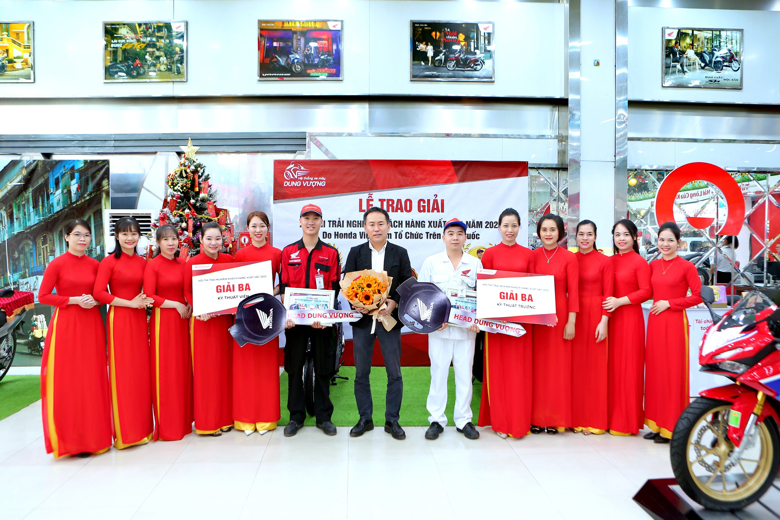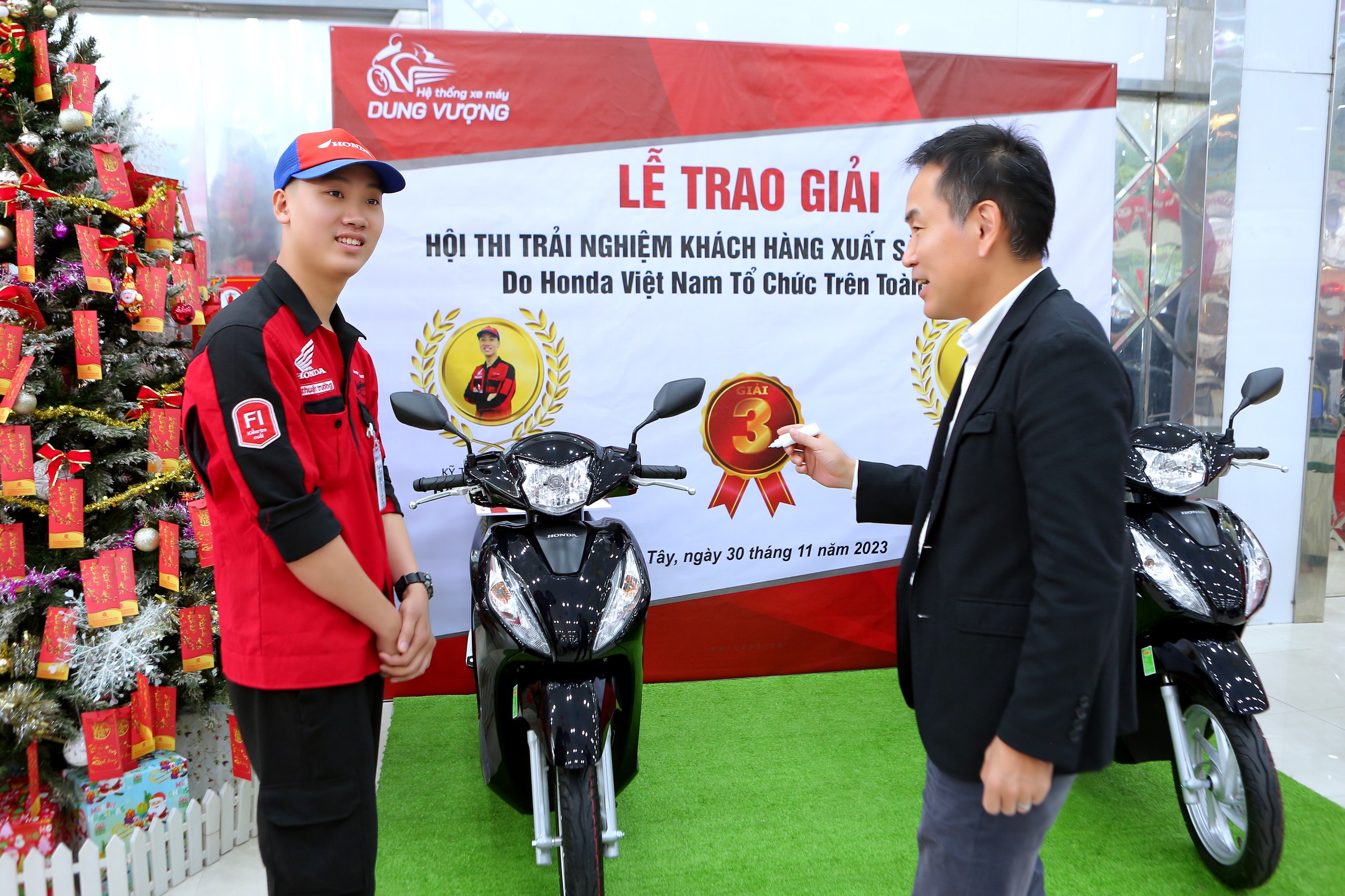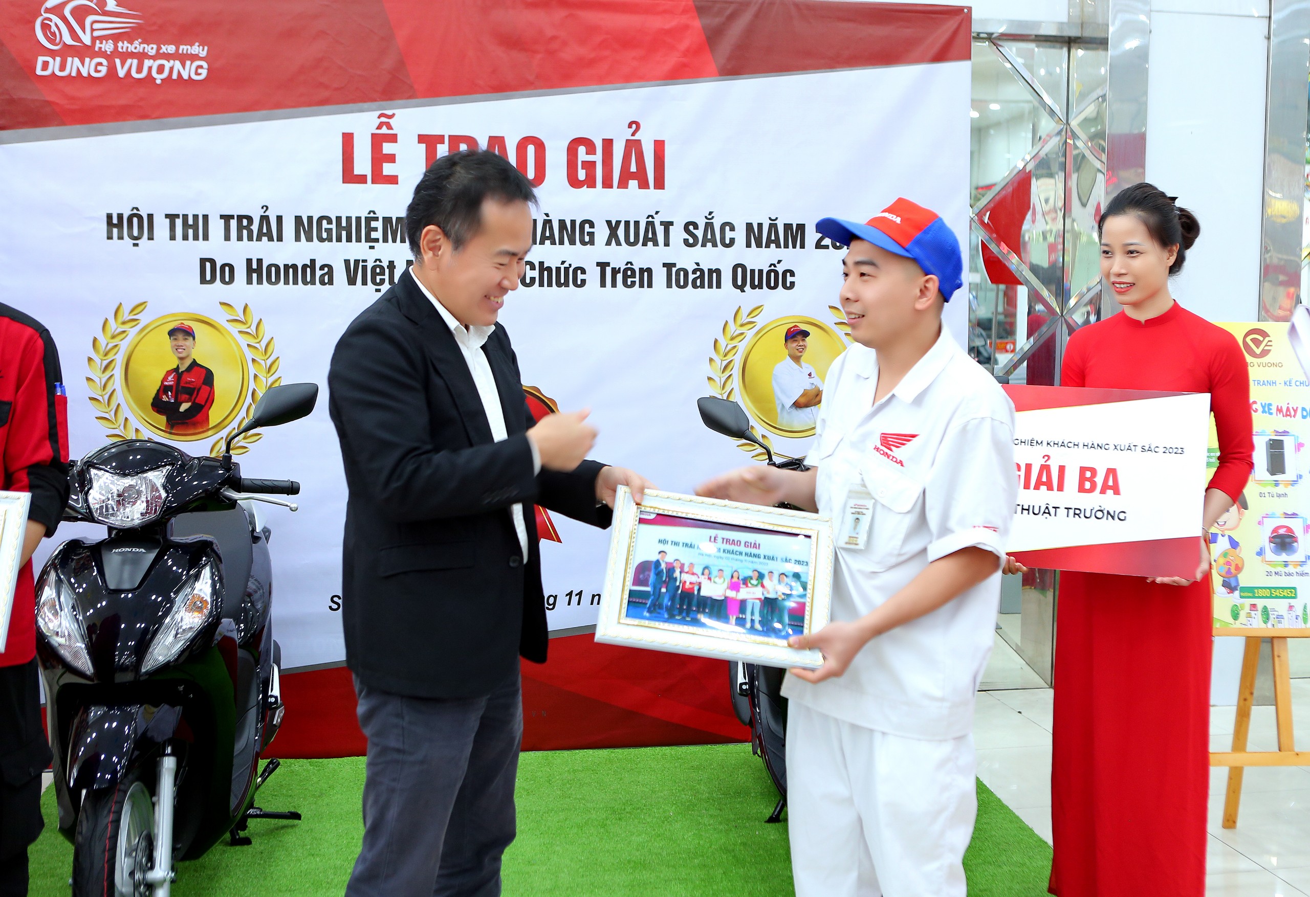 Và đặc biệt, cũng trong buổi làm việc, ông đã trao tặng 2 chiếc xe Honda Vision tới hai bạn: Kỹ thuạt trưởng Hà Đăng Thiện và Kỹ thuật viên Khuất Đình Hưng - Đạt giải Ba Hội thi trải nghiệm khách hàng xuất sắc 2023 do Công ty Honda Việt Nam tổ chức. Đây là niềm vinh dự vô cùng to lớn dối với Đại gia đình Hệ Thống Xe Máy Dung Vượng.