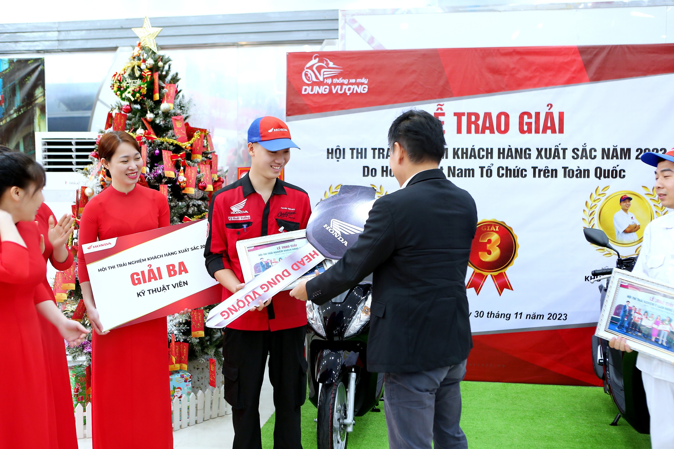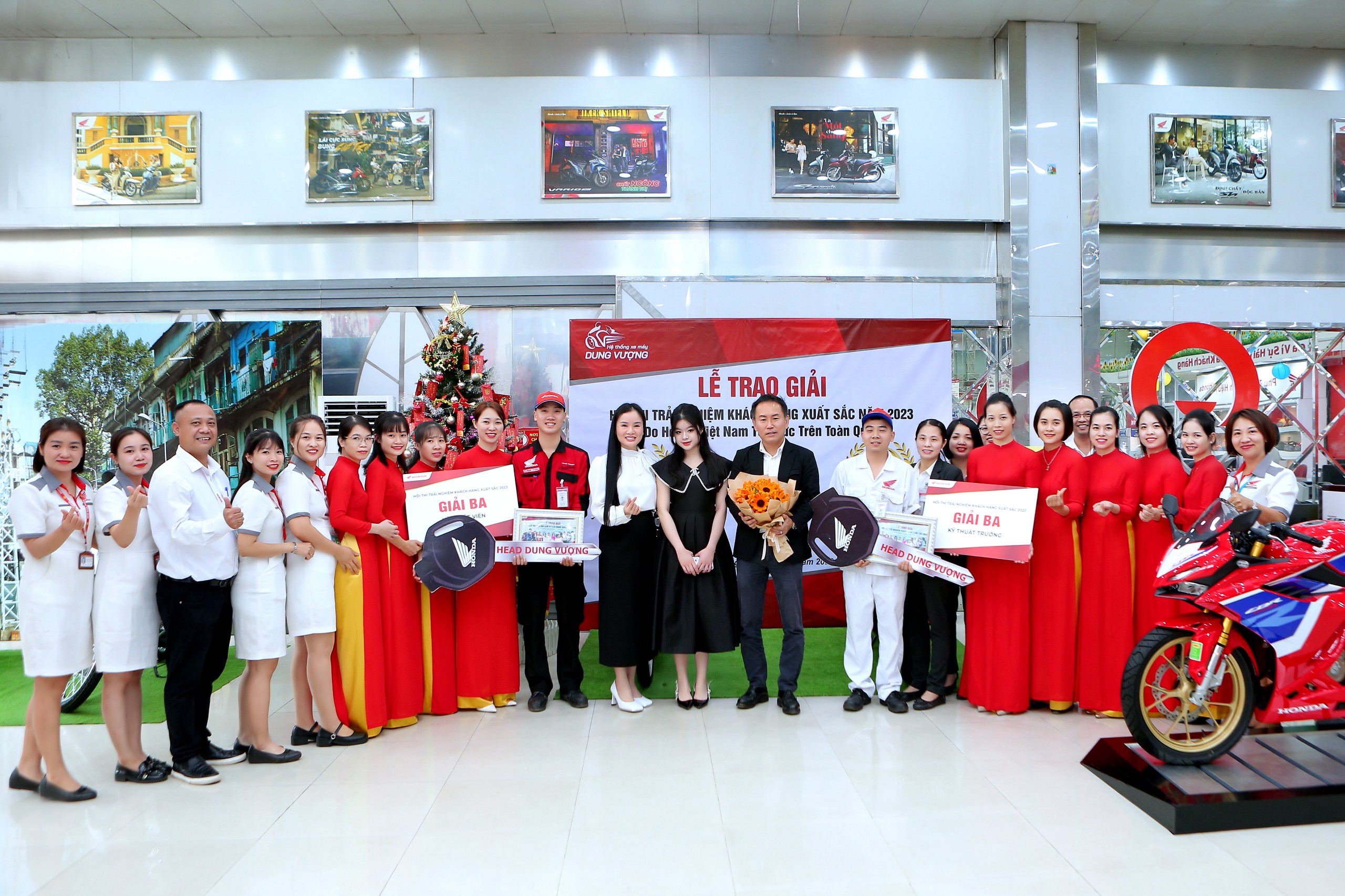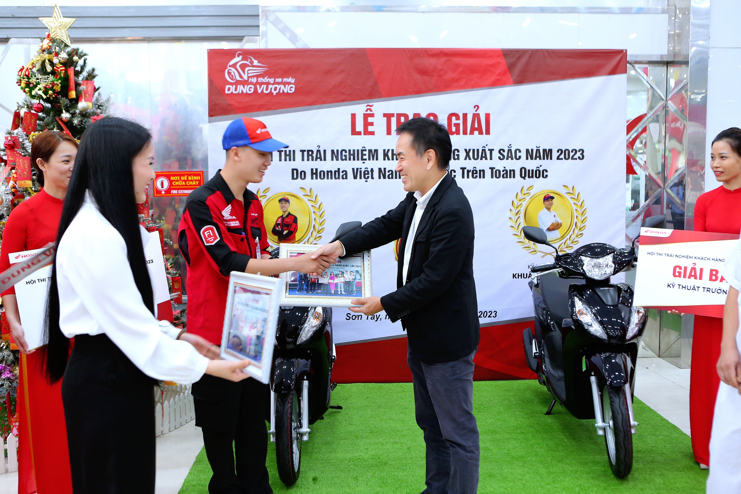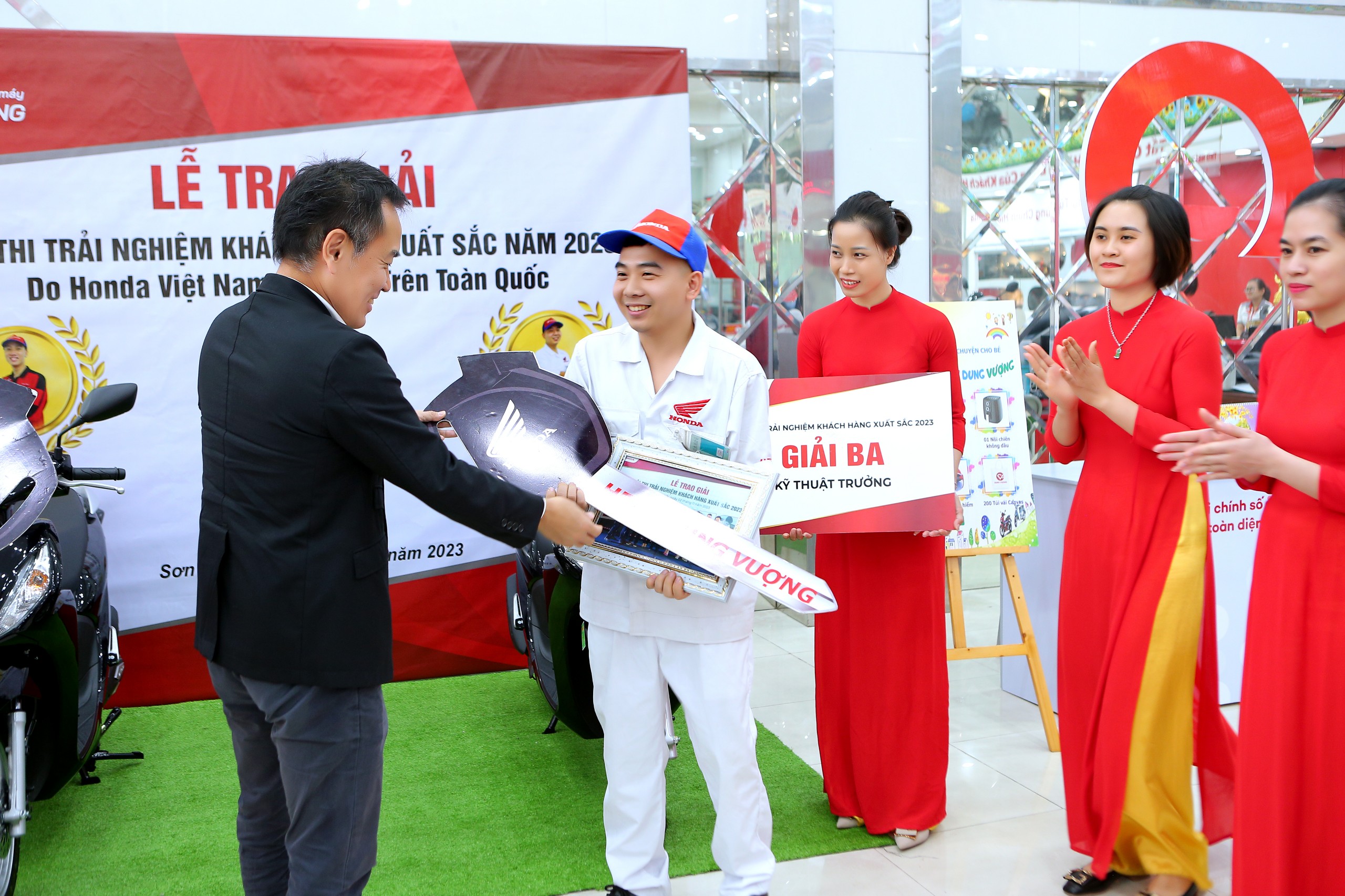 Và đặc biệt, cũng trong buổi làm việc, ông đã trao tặng 2 chiếc xe Honda Vision tới hai bạn: Kỹ thuạt trưởng Hà Đăng Thiện và Kỹ thuật viên Khuất Đình Hưng - Đạt giải Ba Hội thi trải nghiệm khách hàng xuất sắc 2023 do Công ty Honda Việt Nam tổ chức. Đây là niềm vinh dự vô cùng to lớn dối với Đại gia đình Hệ Thống Xe Máy Dung Vượng.