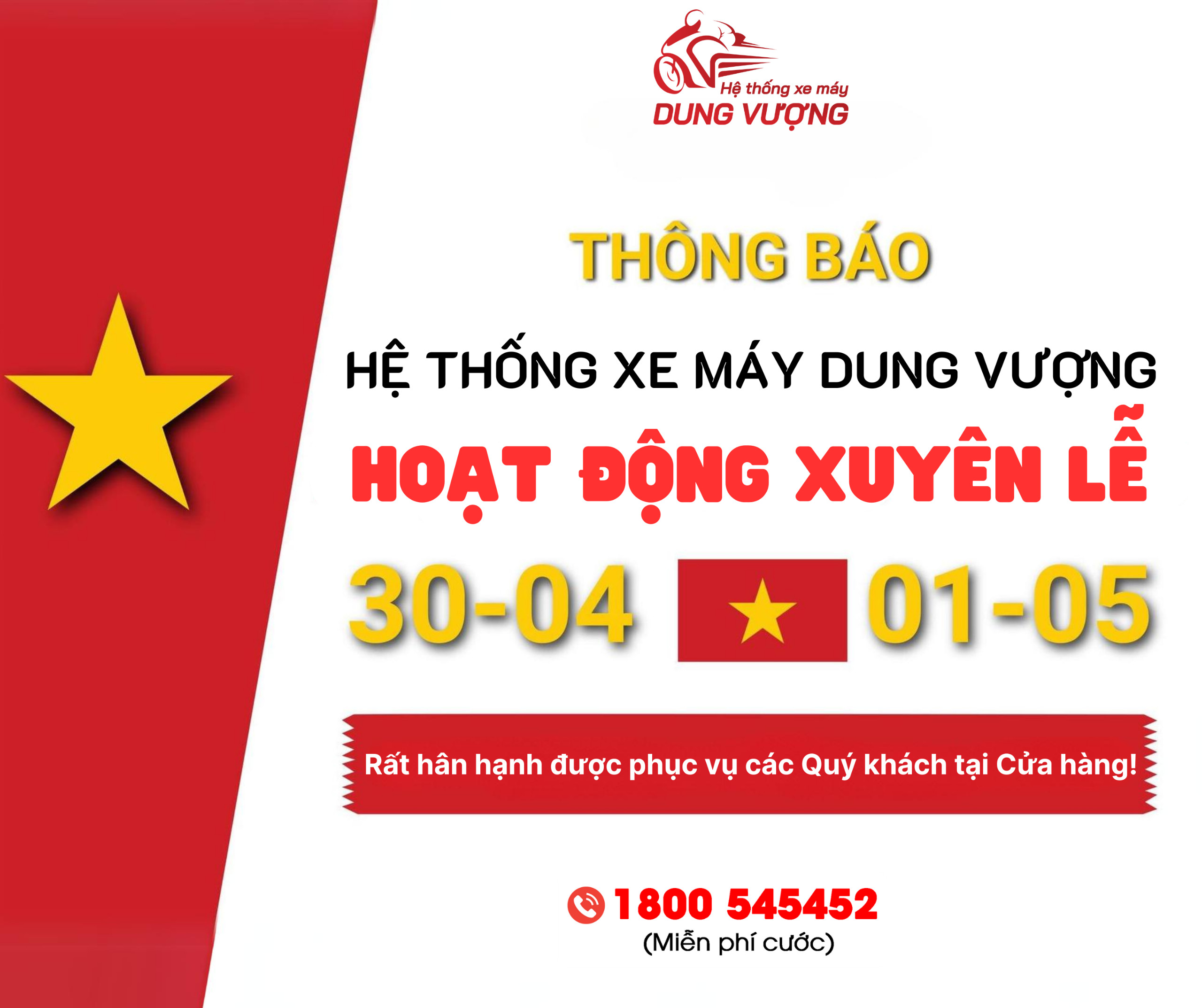 Hệ Thống xe máy Dung Vượng vẫn mở cửa phục vụ Quý khách hàng xuyên dịp Lễ.