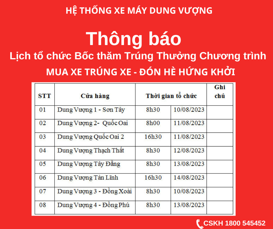 Hệ Thống Xe Máy Dung Vượng xin trân trọng thông báo: Lịch Bốc thăm Trúng Thưởng Chương trình "Mua xe trúng xe - Đón hè hứng khởi". Dành cho khách hàng mua xe tại hệ thống từ ngày 09/6 đến 09/8/2023 như sau: