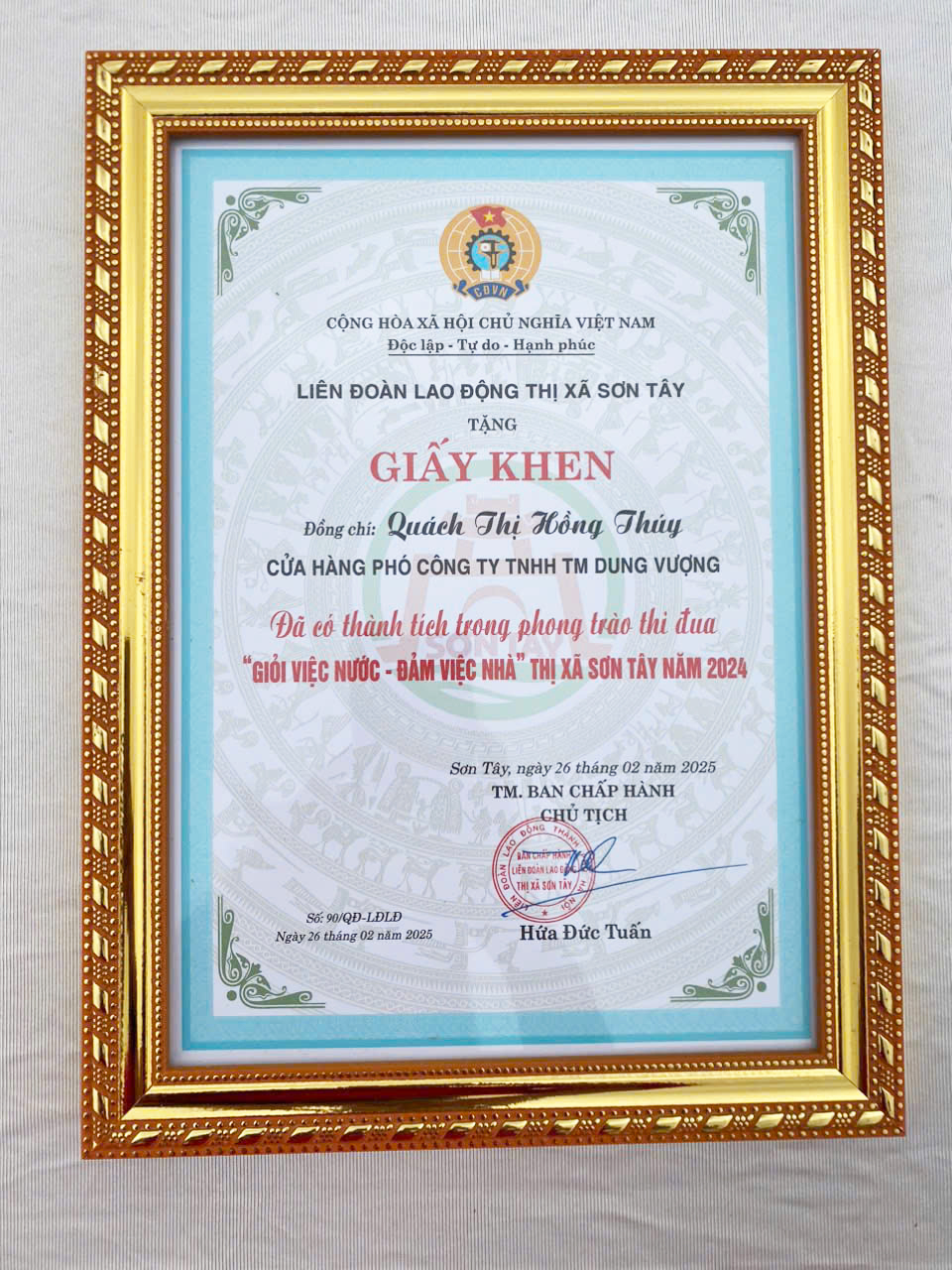 Tại Hội nghị Đ/C Quách Thị Hồng Thuý - Phó Cửa hàng trưởng HEAD Dung Vượng - Công ty TNHH TM Dung Vượng đã vinh dự được nhận giấy khen thành tích xuất sắc trong phong trào thi đua "Giỏi việc nước -Đảm việc nhà" năm 2024 do LĐLĐ thị xã Sơn Tây phát động.