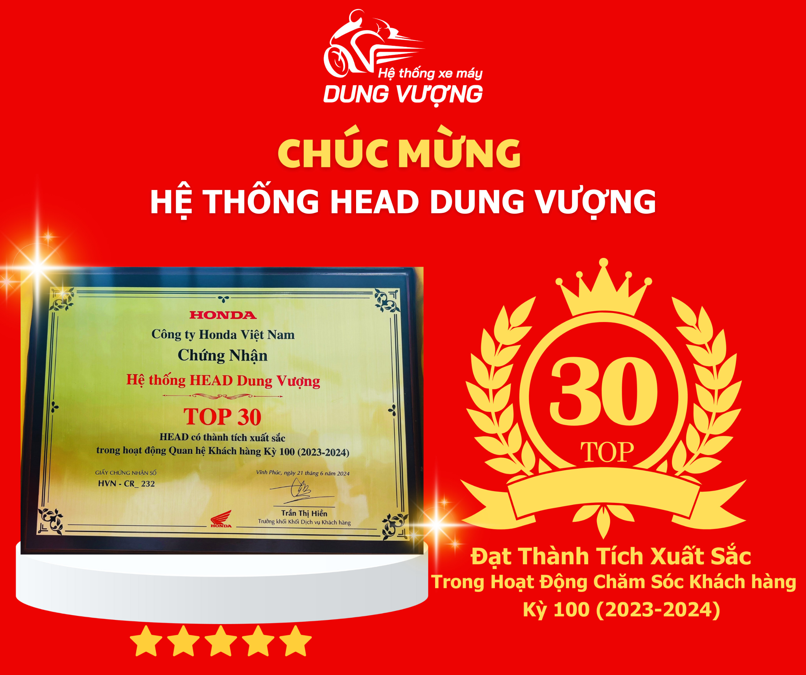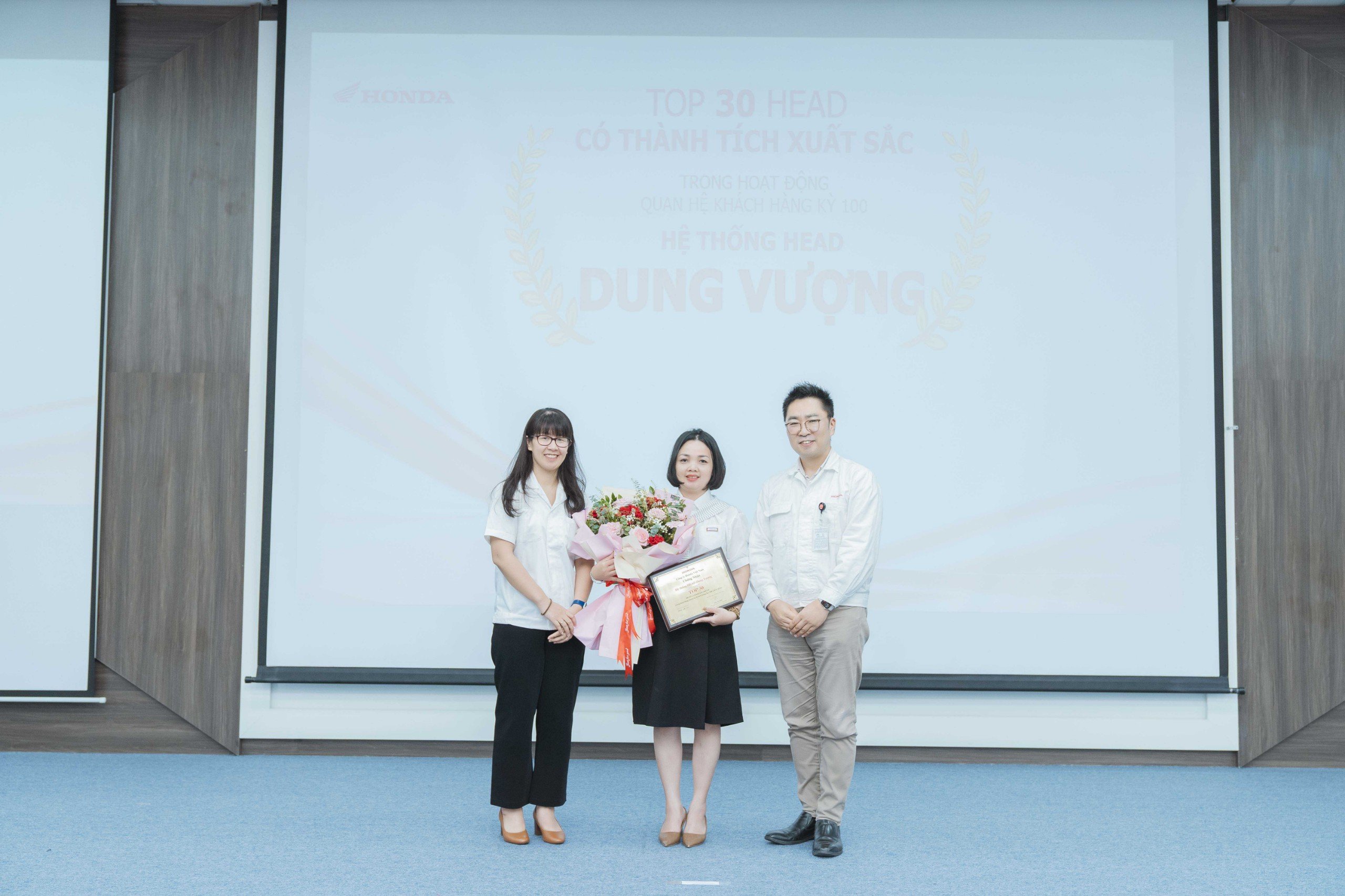 Đây là lần thứ 9, liên tiếp Phòng QHKH Hệ Thống HEAD Dung Vượng đạt TOP HEAD có hoạt động Chăm Sóc khách hàng xuất sắc nhất do Công ty Honda Việt Nam và khách hàng bình chọn.