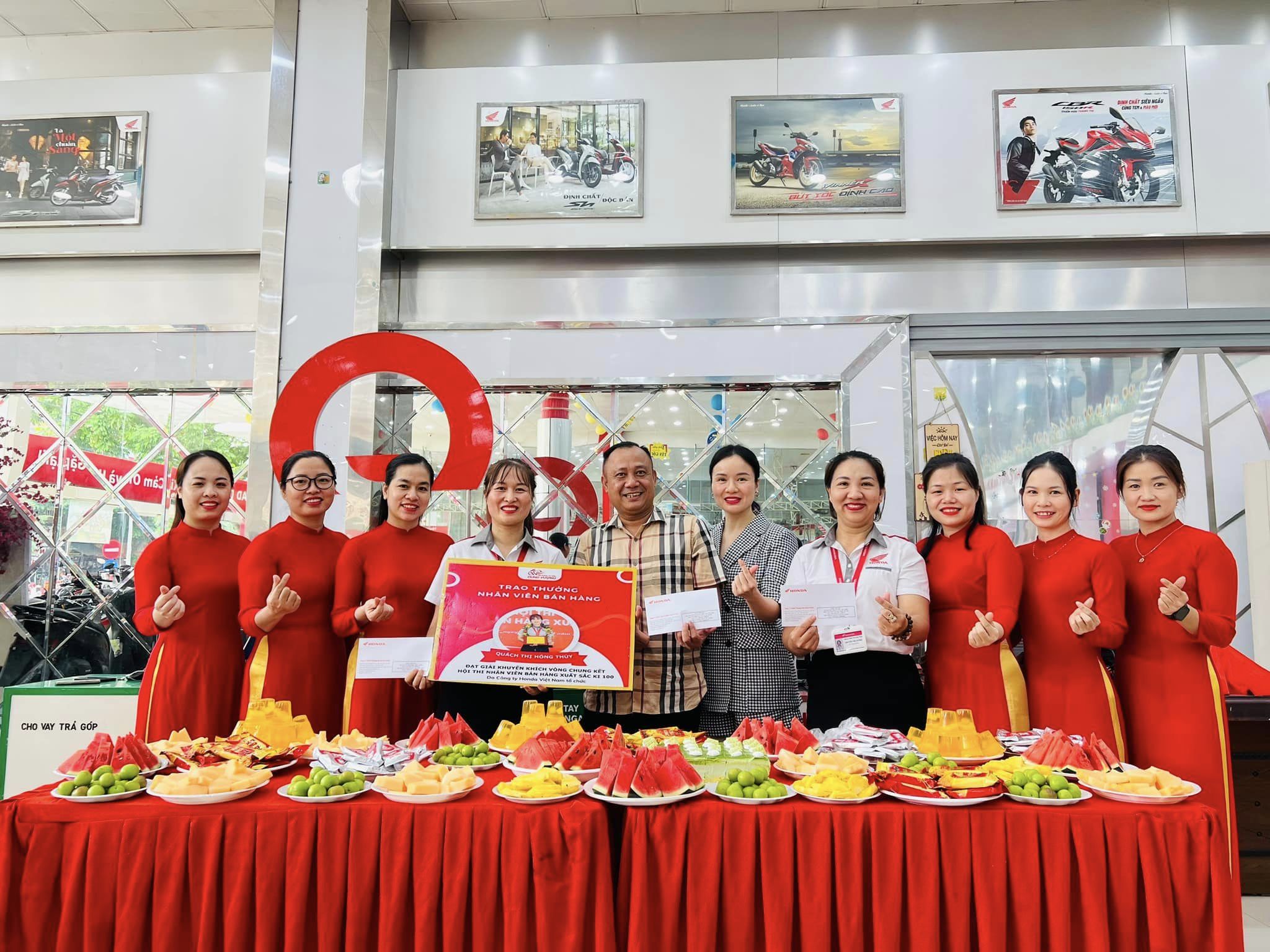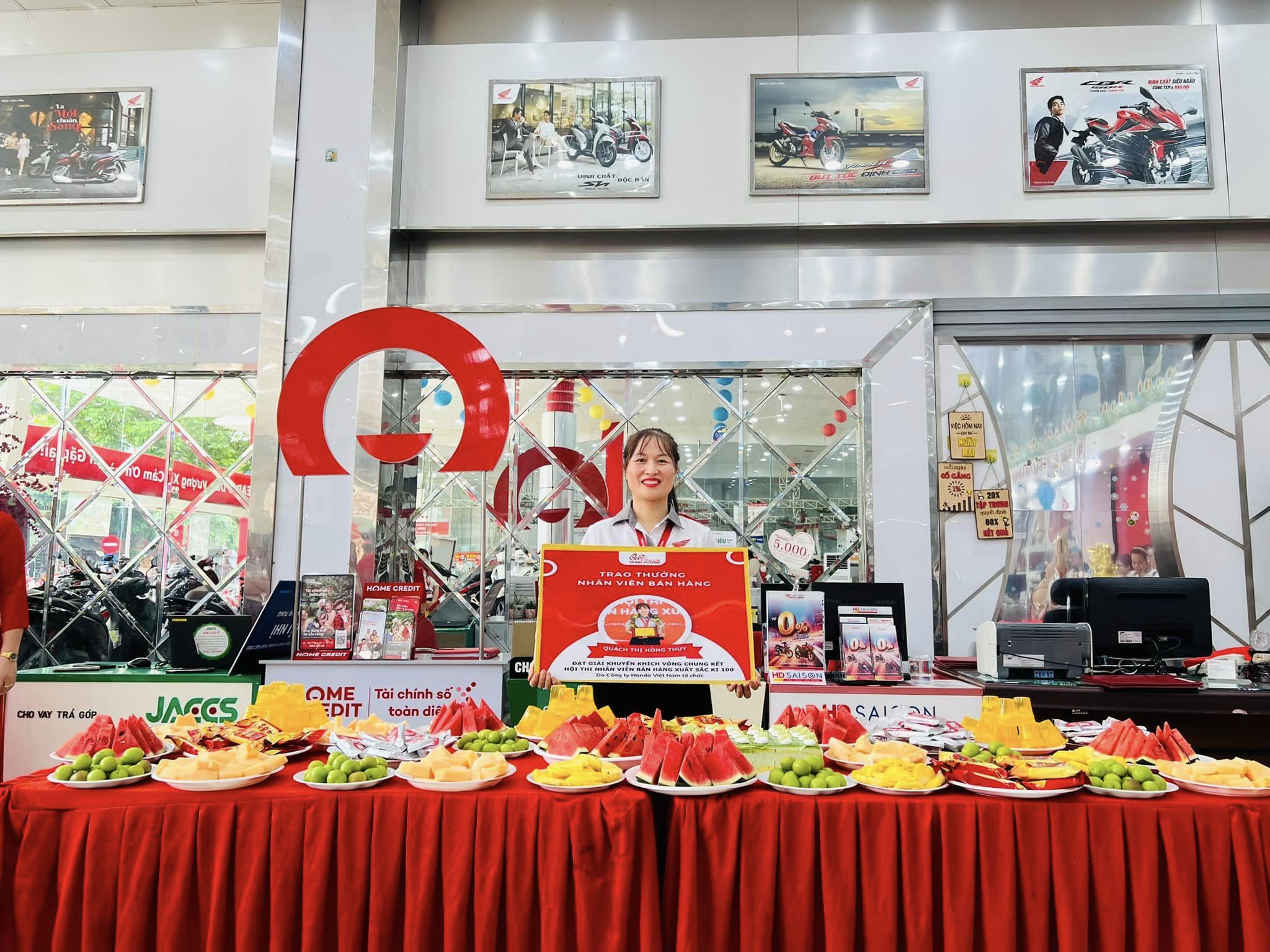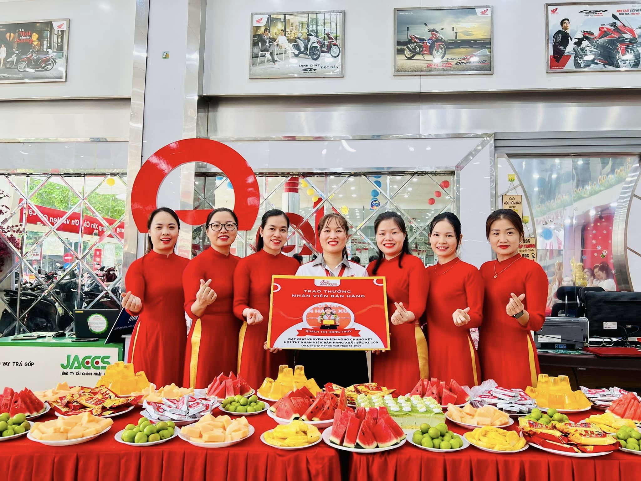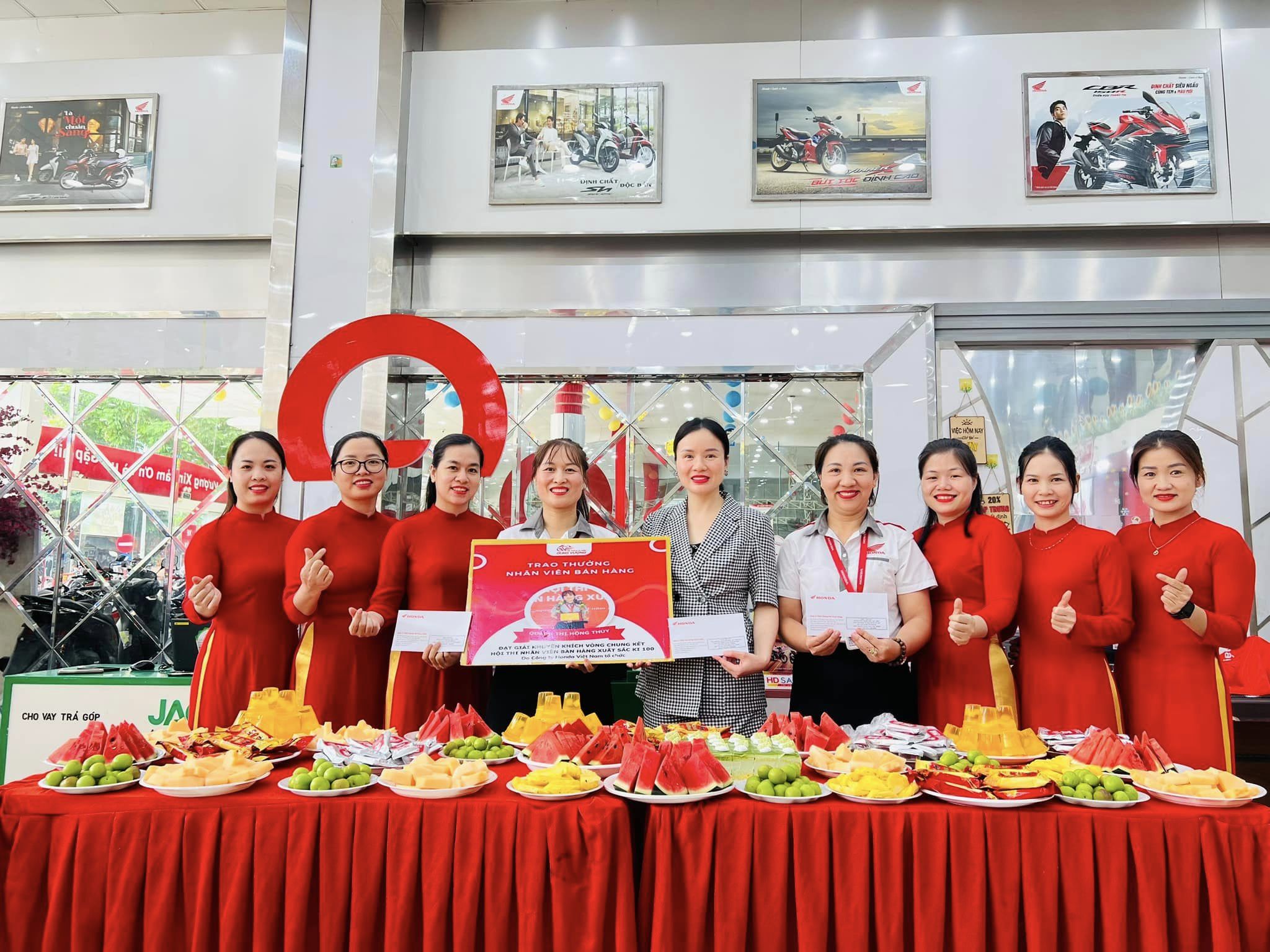 Ngày 26/6/2024 Hệ Thống xe máy Dung Vượng tưng bừng tổ chức trao thưởng cho bạn Quách Thị Hồng Thúy - Nhân viên bán hàng HEAD Dung Vượng #1 đã xuất sắc vượt qua hơn 12.000 thí sinh trên toàn quốc đạt giải khuyến khích của hội thi Nhân viên bán hàng xuất sắc 100 KI do Công ty Honda Việt Nam tổ chức.