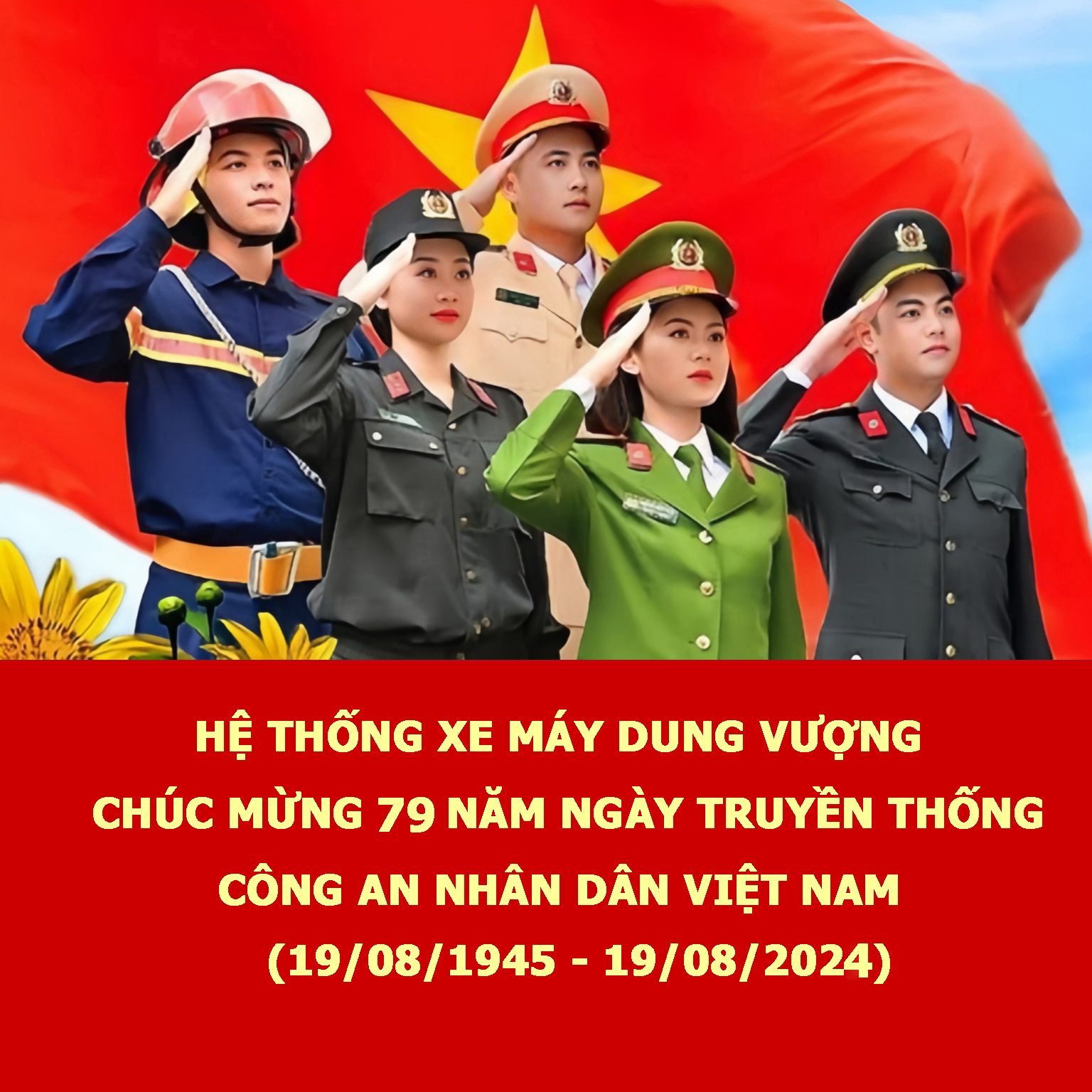 Nhân ngày 19/08 - Ngày vinh danh lực lượng Công An Nhân dân Việt Nam. Hệ Thống xe máy Dung Vượng xin gửi những lời chúc tốt đẹp nhất đến các đồng chí đã và đang làm việc phục vụ trong lực lượng Công An Nhân Dân lời chúc sức khỏe, chúc các đồng chí học tập, công tác tốt và hoàn thành xuất sắc mọi nhiệm vụ được giao.